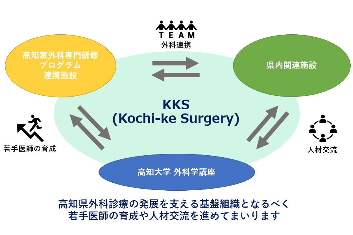 KKS(Kochi-ke Surgery)は、高知大学医学部外科学講座同門会及び、高知家外科専門研修プログラム連携施設を含めた包括的組織のことで、 高知県外科診療の発展を支え、若手医師の育成や人材交流を進める組織です(下図参照)。